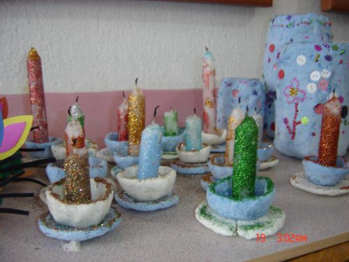 seramik hamurundan mumluk ve süslü mumlarımız,şarkı söyleyen çocuklarımız,süngerden tavşanlarımız…