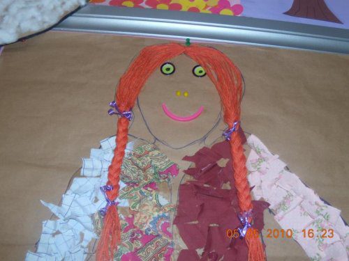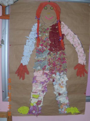 Kraft kağıdına en kısa boylu çocuğu yatırıp çizdik. çocuklar artık kumaşları kestiler ve çocuğumuza yapıştırdılar daha sonra artık materyalleri değerlendirerek kafasini da yaptıkkk