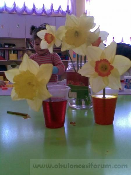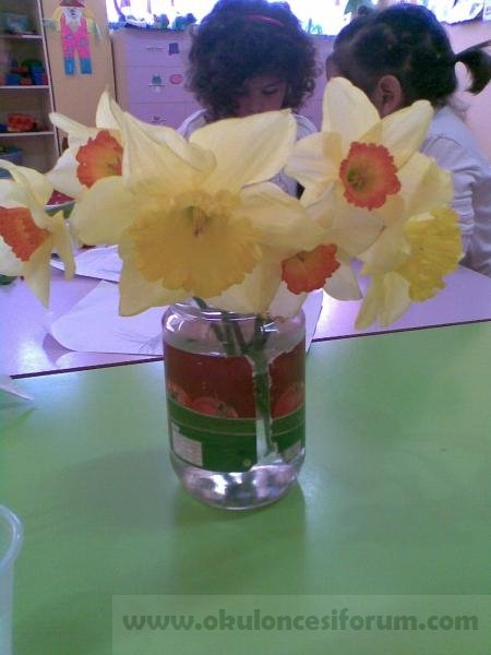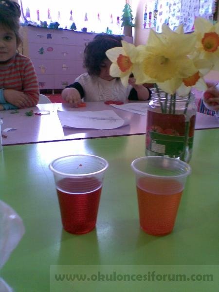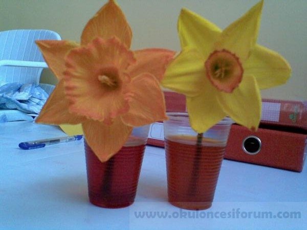 Çiçekleri sabah öğrencim Ecem Naz getirmişti.İki bardağın birine kırmızı renk diğerine turuncu renk gıda boyası koyup karıştırdım sonrada çiçekleri içine koydum akşam üstü bu hale gelmişlerdi…