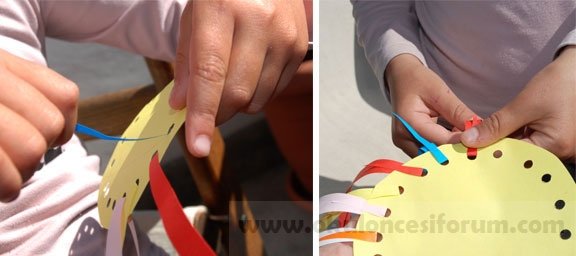 Bir daire hazırlayın.Etrafına zımbayla delikler açın. Her deliğe şeritleri geçirerek yapıştırmayı yalnız çocuklara bırakın. Tüm delikleri dolu olduğunda, küçük ağız ve gözleri koysunlar 🙂