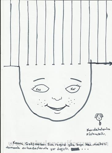 İlk makas kesme çalışmalarıyla faaliyetlere devam ediyorum. Ama tekrar söylemekte fayda var bunun öncesinde sırayla makası anlattık keskin ve sivri olduğunu belirtik . Daha sonra hamuru kesmeye başladık , gazetede gelişi güzel kesmeler yaptık sonra çizgilere geçtik ama büyük ebatta kağıtlar değil 2 ye 2 santimlerde karelerle başladık … Ben kimim konusuyla da örtüşen çok güzel ve eğlenceli bir çalışma. renkli A4 kağıdı yerine beyaz a4 fotokopi kağıdını boyamalarını tercih ediyorum. Böylece boyama yapma ve küçük kas gelişimlerini de desteklemiş oluruz. Küçük kurdeleler şöniller ipler Pipetler maskemizi oluşturmada yardımcı olacaktır.