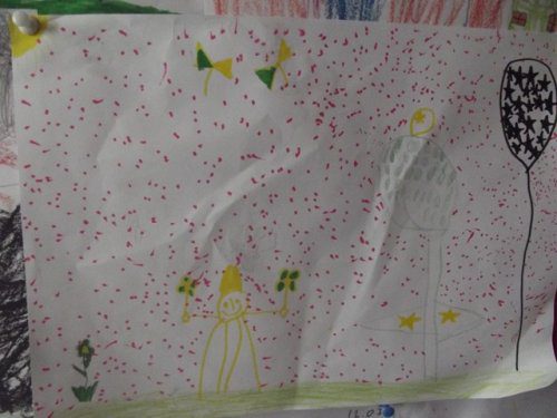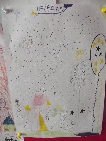 Birkaç tanesi de tamamen boyamak istemiyoruz biz karalak oluyor diyip gökyüzünü nokta nokta boyadılar. Aslında büyük ihtimalle üşengeçlikten böyle yaptılar ama keçeli kalemle bu şekilde daha güzel oldu.