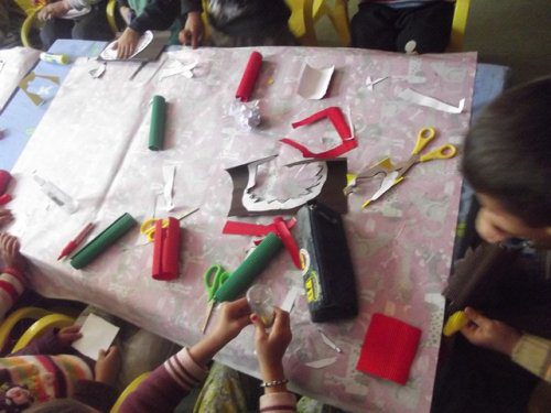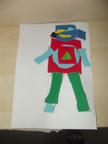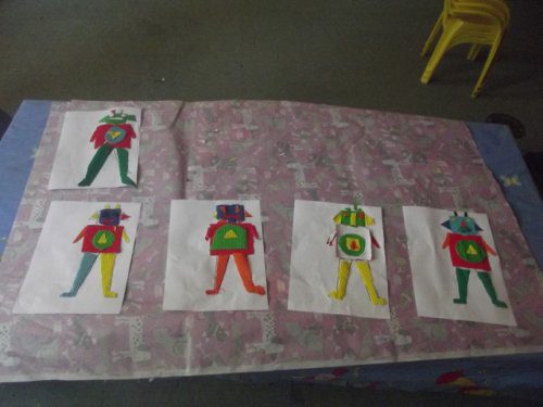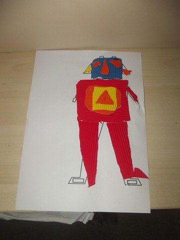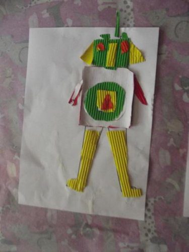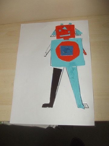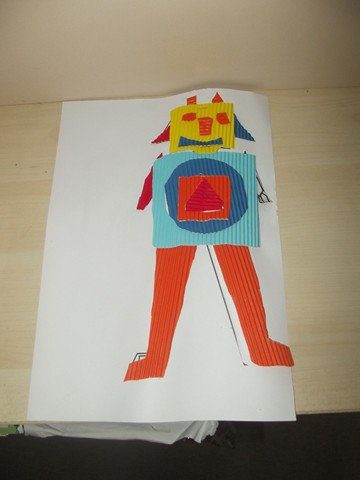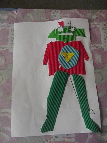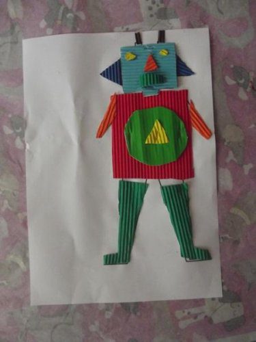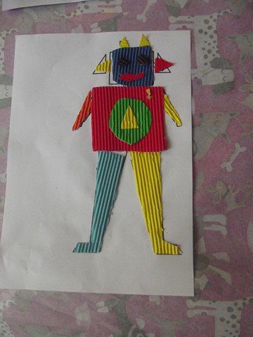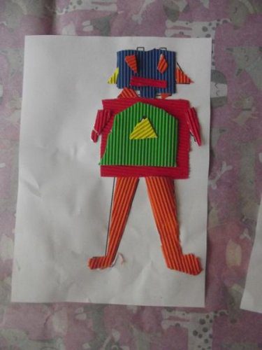 Önce rar dosyasının içindeki word dosyasının içindeki 1. sayfayı çocuklara verdim. Her çocuğa da 5-6 renk oluklu mukavva verdim. Çocuklar parçaları kesip oluklu mukavvaların arkasına yapıştırdılar. Sonra da çizgilerden oluklu mukavvaları kestiler. 1. sayfayı (yani resmi) verdim. Ve kestikleri oluklu mukvalları resme yapıştırdılar. 2. sayfayı vermedim ve kalan kısımları resme bakıp kendilerinin tamamlamasını istedim. (Herkes kendince kesince daha güzel oldu sanırım. Tüm robotlar farklı oldu)