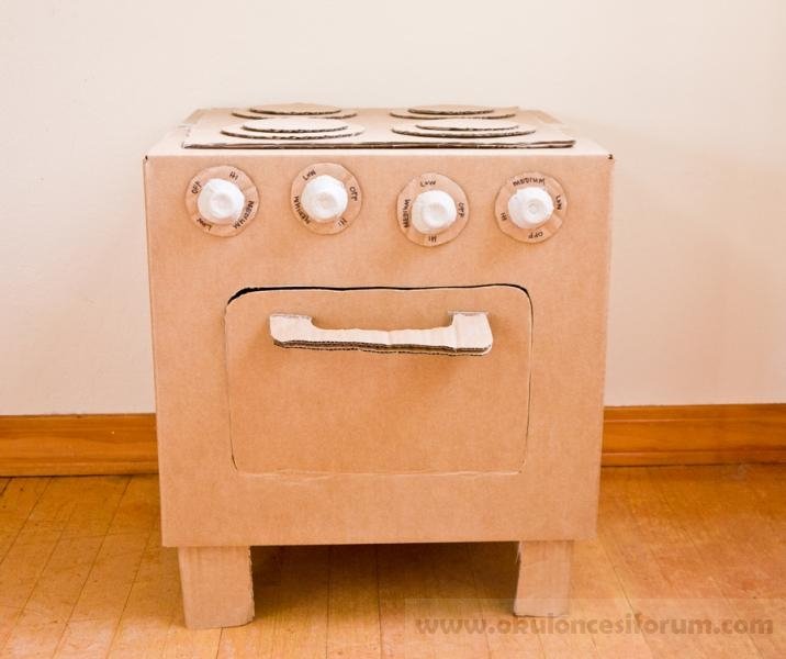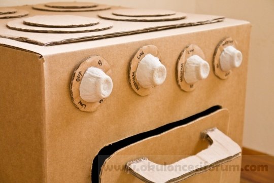 Karton kutulardan yapılacak fırın maketi için önce temel maket bölümünün tamamlanması gerekmektedir. Yani büyük boyutta bir kutu, fırına benzeyecek biçimde biçimlendirilmelidir. Kutunun ön yüzeyinde köşeleri oval olacak biçimde bir kare bölme oluşturulmalıdır. Bu bölmenin tamamen kesilmesi ya da alt kısmının yapışık bırakılması tercihe kalmaktadır. Ardından fırın maketinin üst yüzeyindeki ocak görünümü oluşturulmalıdır. Yine kartonlardan kesilecek yuvarlak parçaların ocak gözü maketi oluşturacak biçimde ana gövdenin üst yüzeyine yapıştırılmalıdır. Böylece karton kutulardan fırın tasarımı etkinliği yapımı neredeyse son evreye gelmektedir. En son yumurta kolilerinden kesilen parçaların fırın maketinin düğmeleri olacak biçimde ön yüzeyin en üst kısmına yapıştırılması gerekmektedir. Çocukların fırın maketi bittiğinde çeşitli boyamalarla bu maketi süslemeleri de gayet eğlenceli anlar yaratacaktır.