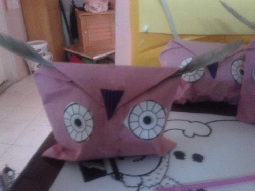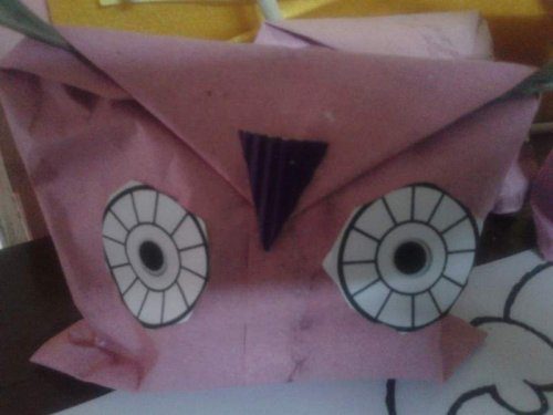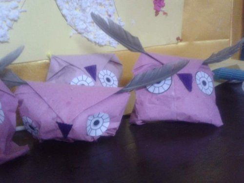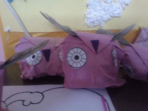 Bu etkinliğimiz baykuştu. Çocuklara Birer kağıt verdim ve bu kağıtları katlayarak ve yapıştırarak kese kağıdı yaptık. Kese kağıtlarına önceki etkinliklerden artmış ufak grafon kağıdı parçalarını doldurduk. 2 göz 1 burun ekledik. Ertesi gün de 2şer tüy getirdiler. Ve etkinliğimiz bu hale geldi: