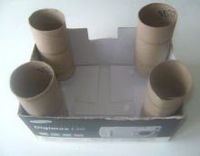 Öncelikle Dikdörtgen kükük bir kutunun içine 4 adet karton ruloyu köşelere yerleştirmişler. Şatonun direklerinin sivri çatılarını burdaki Etkinlikteki gibi yapabilirsiniz.Kapı kesilmiş boyanmış ve kutunun üstüne yerleştirilmiş.