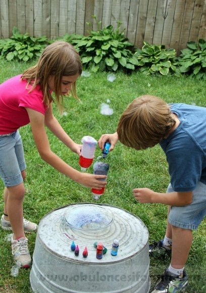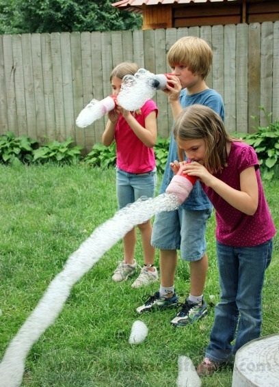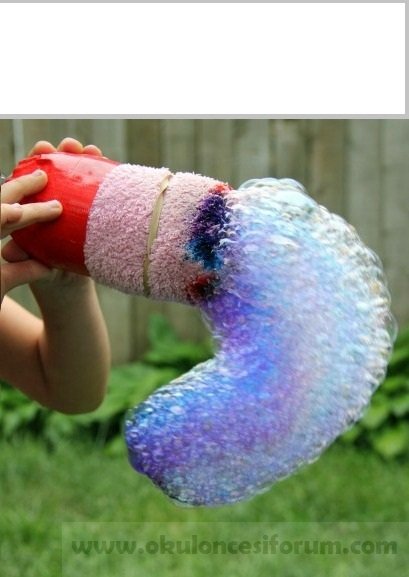 Şişenin dibini kesin,çorabı geçirerek koli bandıyla bantlayın,sığ bir kabın içine biraz deterjan koyarak karıştırın,Köpürcük makinemizi batırın ve üfleyin…!