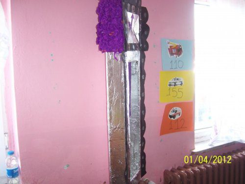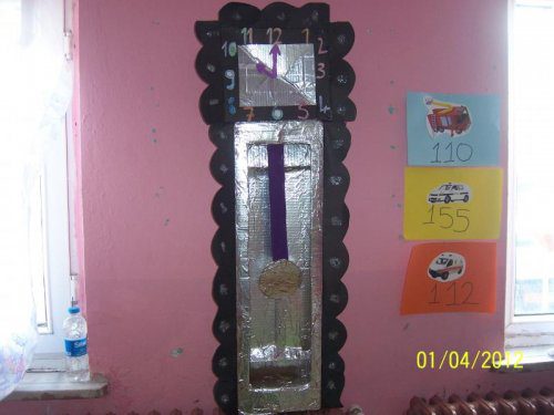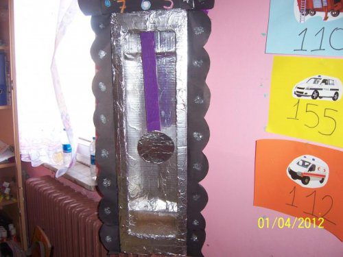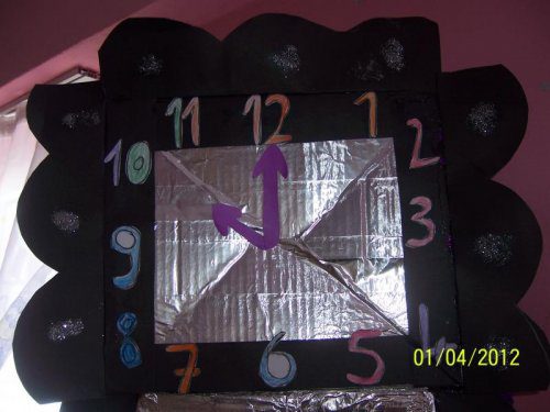 çocuklar grapon kağıtlarını yuvarladılar ve bereber yapıştırdık, gümüş renkli bantla kutuyu kapladık bunda erkeler yardımcı oldu ve rakamları boyayıp kestiler ben sonra düzelttim ve süsledik püsledik saatimizi yaptık