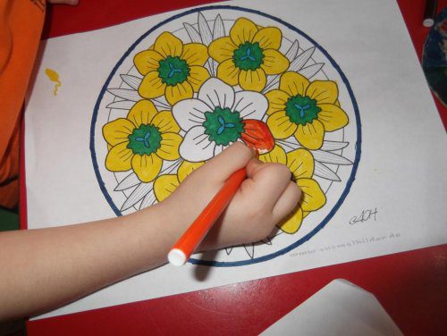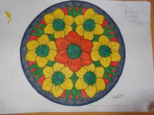 Mandala boyamak yoluyla sakinliğe ulaştırır, rahatlatan bir etki yapar. Bu çalışmadan sonra grup çalışmasında, uyum sağlamada olumlu etkiler görülür. Çocukların stresi azalır, çocuklar daha uyumlu hale gelirler. Mandala çalışması dıştan içe veya içten dışa boyanır. Önemli olan sırayı bozmamaktır.