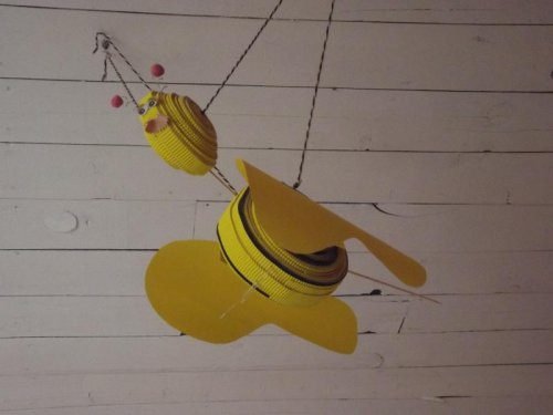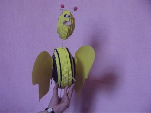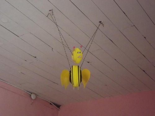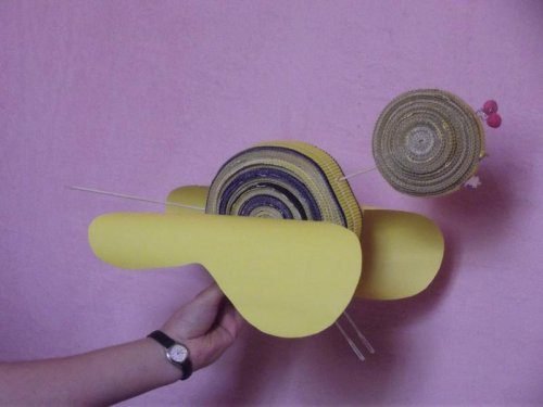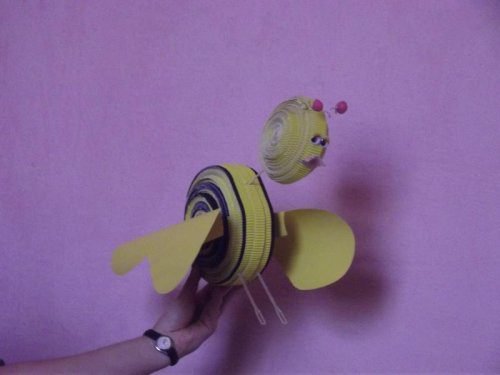 Oluklu kartonu uygun renklerde şerit halinde kestim. Çocuklar da sırayla kartonları birbirinin üzerine doladılar. Biri büyük biri küçük olmak üzere 2 daire yaptık. Fon kartonundan kanatlarını , plastik çay kaşıklarıyla ayaklarını , kürdan ve oyun hamurlarıyla antenlerini , tahta şişle de kuyruğunu yaptık.