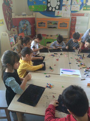 Pastel Boya Ile Kağıtlarımızı Rengarenk Boyadık,Üzerini Siyah Yağlı Pastel Boya Ile Renkleri Kapatarak Kalemlerimizle Resimlerimizi Yaptık.