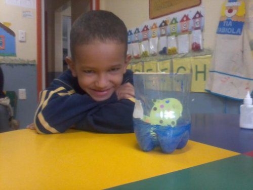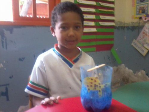 Parmak boyasıyla,pet şişe boyanmış ve balık,iple dondurma çubuğuna bağlanmış arkadaşlar.