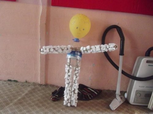 Kollar ve bacaklar karton rulo , vücut 5lt. lik şişe , kafa da balondan oluşuyor.