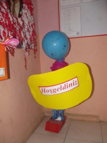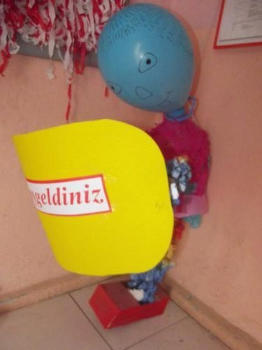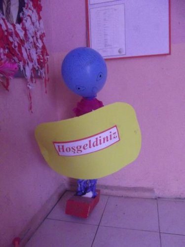 Farkettiyseniz kafadaki balonun rengi farklı. Çünkü soğuk yüzünden kafasına koyduğumuz balonlar iniyor. Sene başından beri 5 defa balon değiştirdik. Çocuklara balona kafa çizdiriyorum. Sonra oylama yapıp en çok oy alanı kafaya takıyorum. )