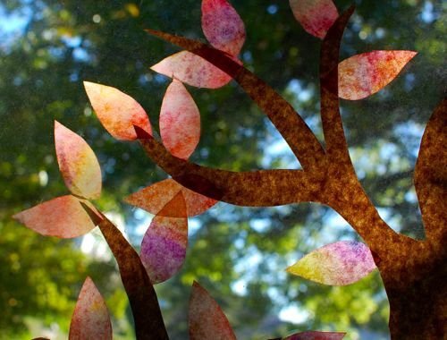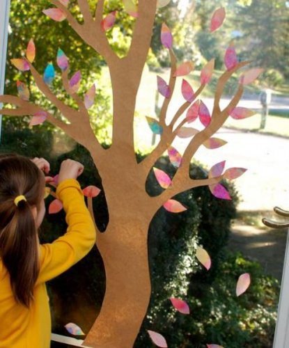 sonbahar renklerine boyadıktan sonra kurumasını bekleyip yaprak şeklinde kesiyoruz ve ağacımıza yapıştırıyoruz