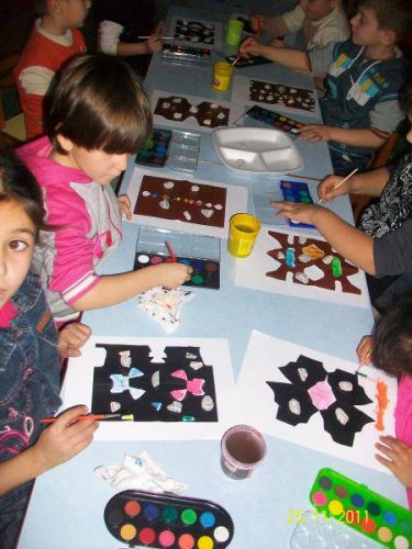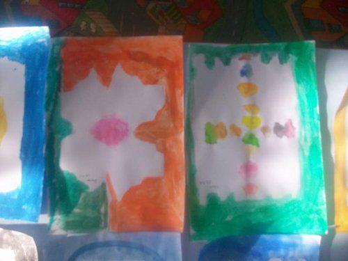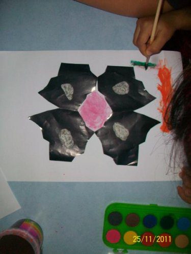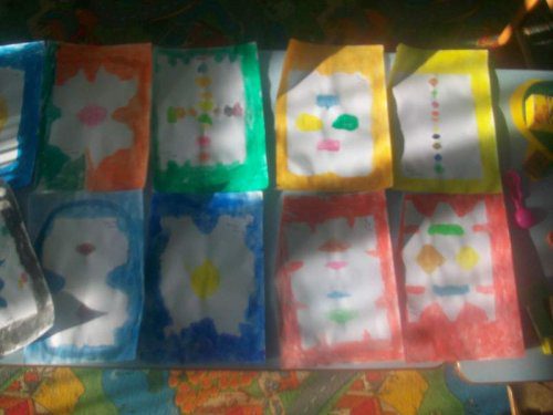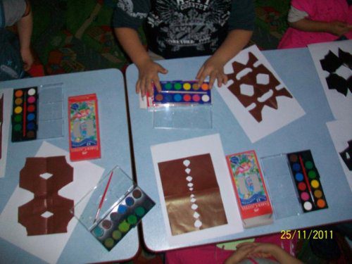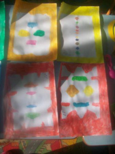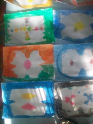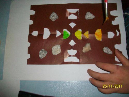 ….Fotoğraflardan da anlayacağınız üzeree : her çocuğa yarım elişi kağıdı veriyoruz. katlama ve kesme sonucu hepsinin,farklı şekil ve desende elişi kağıdı oluyor. daha sonra bunları,A4 kağıdı üzerine bir şekilde ( ben iri çakıl taşlarından yararlandım) sabitliyoruz ve çocuklarımız istedikleri renkleri kullanarak boyama yapıyorlar…hem katlama,hem kesme,hem de boyamayı içinde barındıran; çok yönlü ama zahmetsiz ve zevkli bir çalışma…