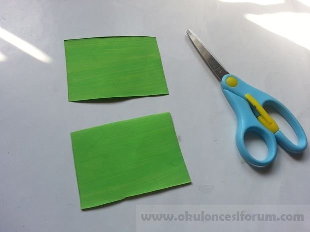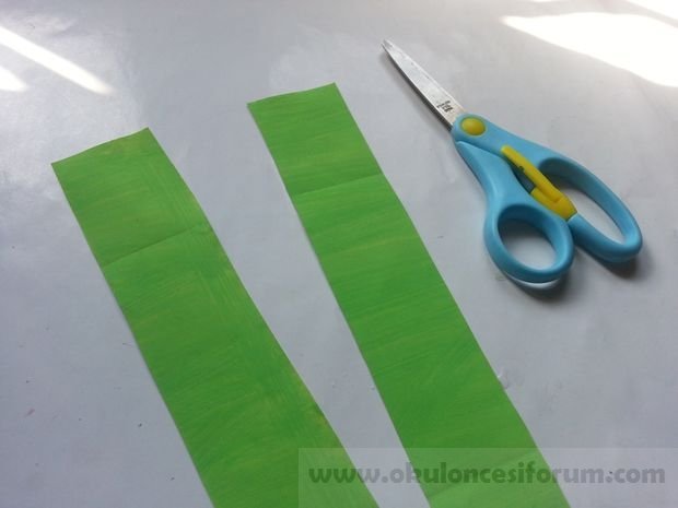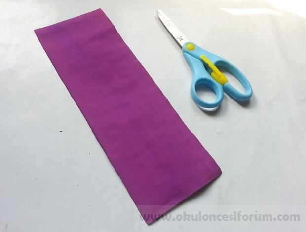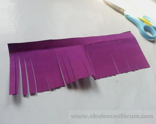 Öncelikle, en az 2cm genişlik ve 8cm uzunlukta şeritler halinde renkli kağıt kesmek zorundasınız. Kestiğimiz saçakları kurtarmak için kağıdımızın ucunu biraz katlıyoruz.
