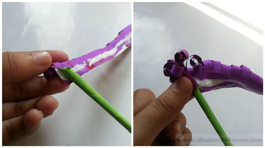 Kıvırdığımız saçaklı kağıdı alın ve sağlam kısmı boyunca tutkal uygulayarak sarın Yeşil (kök) kağıt rulo üzerinde dikkatle kök dibine doğru yuvarlayarak kök üstünden onu yapıştırmaya başlayın,kağıt sonlanana kadar.