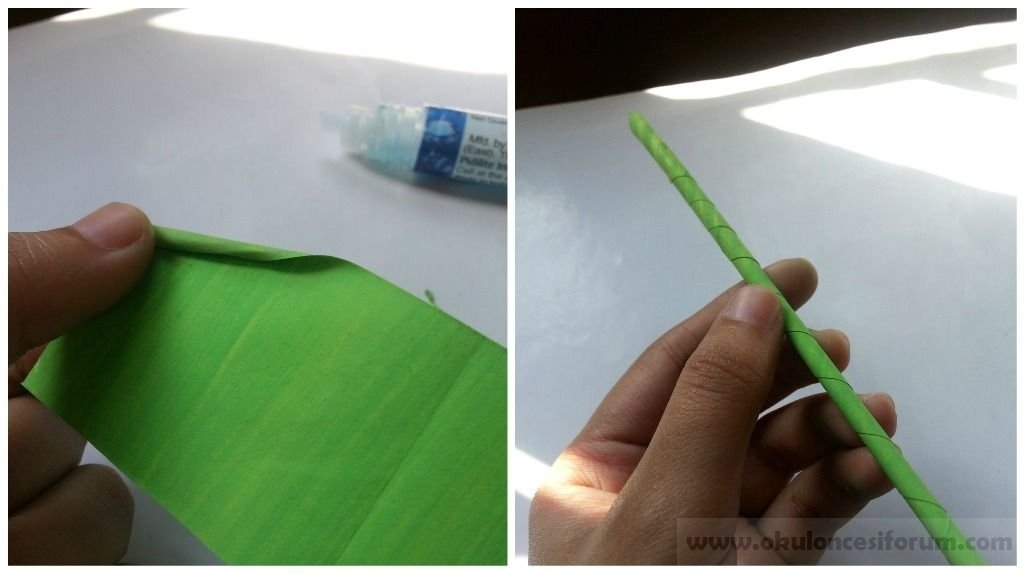 Çiçeği yapmadan önce. Çiçek için bir kök yapmak gerekecek sapını yapmak için yeşil kağıt kullanın.( uzun bir şerit yeşil kağıt 2 x 10 ebatında… herhangi bir ucundan çapraz kıvırarak başlayın ) ve diğer ucunu ulaşana kadar kağıdı kıvırmaya devam edin, kıvırdığın kağıdın her iki ucunu tutkal ile yapıştırın.