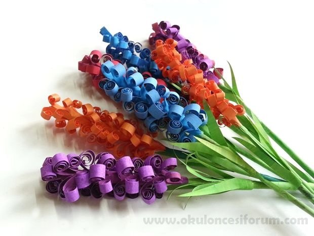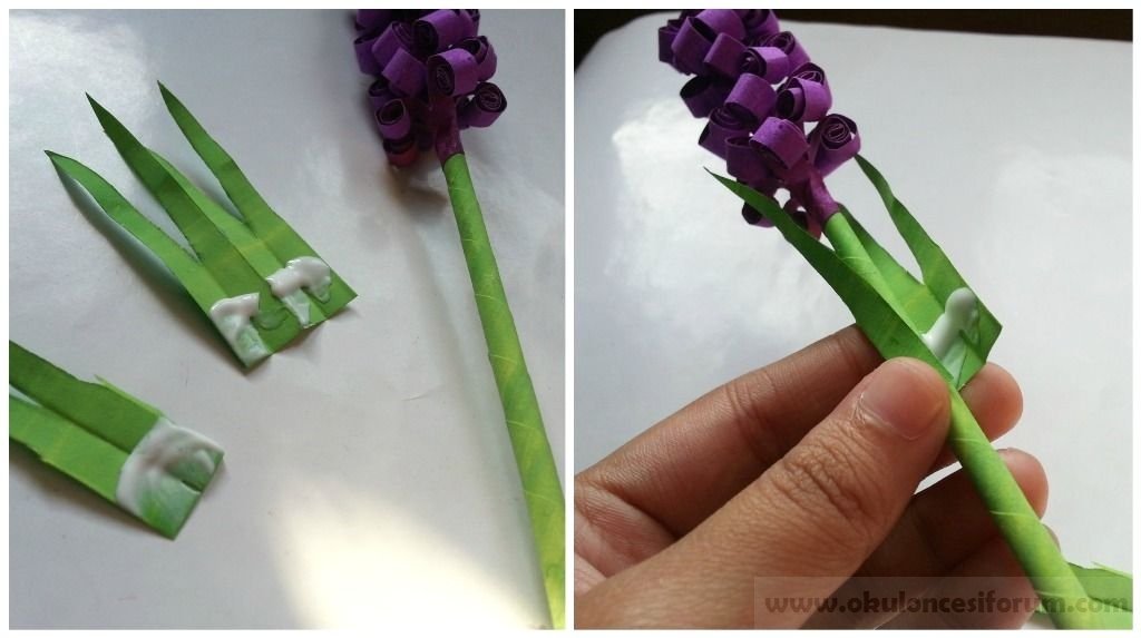 Yaprakları yapmak için yeşil kağıtlar kullanın , küçük bir parça (2 x 3 )yeşil kağıt kesin , 1 cm akordeon kat yaparak katlayın , bir ucunu sivri kesin kağıdı açın ve kök etrafında tutkallayın…Bitti!Farklı güzel renkler kullanarak birçok yapın. Kağıt el sanatları her zaman şaşırtıcı ve bu eğlencelidir….