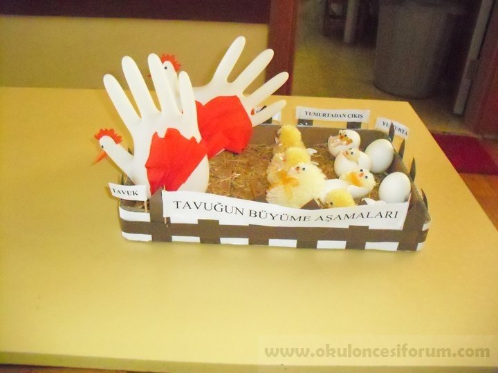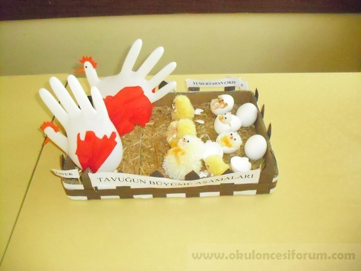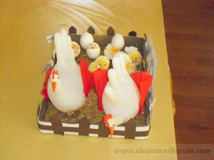 Yumurta,yumurtadan çıkan pom pom civcivler,ve tavuk hali şişme eldivenden.. 🙂