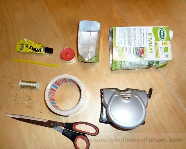 makas, ambalaj bantı, sıvı uhu ya da silikon tabancası,iplik, süt veya meyve kutusu,pipet,mum.