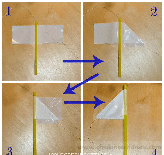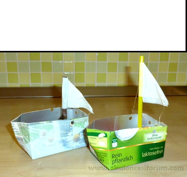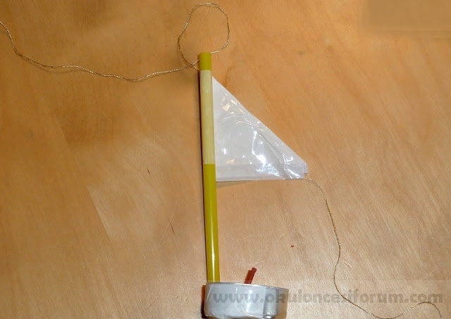 Kutumuzun 1/4 ünü kullanırız.Yelken halatlarını takmak için birkaç delik açarız.Mumu silikon tabancası yardımıyla zemine yapıştırırız.